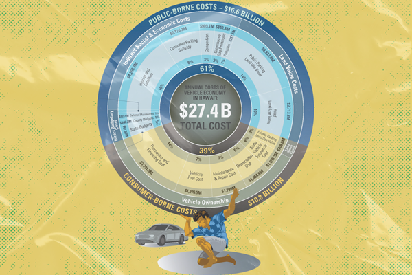 A new report released by Ulupono Initiative and global consulting firm ICF paints a daunting picture of how much the vehicle-based transportation system costs Hawai‘i residents. A hefty $27.4 billion is going into the state’s vehicle economy – which includes roadways, bridges, vehicles, parking and societal costs – a huge strain on household budgets that are already stretched thin.