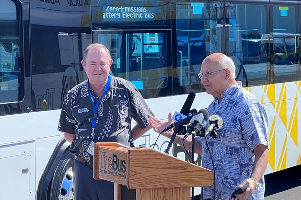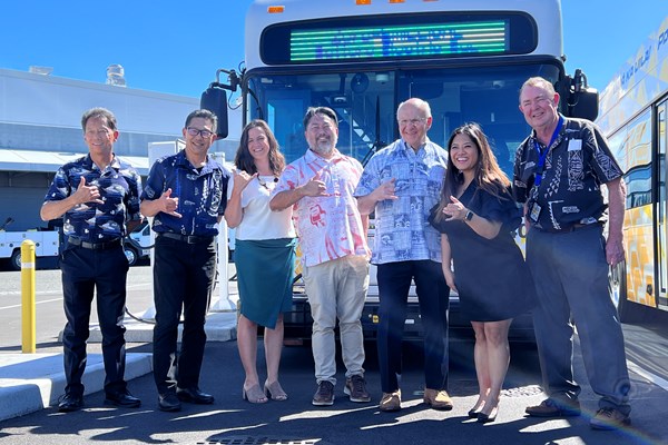 The mayor was joined by Councilmember Radiant Cordero and representatives of several City departments, Hawaiian Electric, and others. These included DTS Director Roger Morton; Robert Yu, president and general manager of Oahu Transit Services; Nicola Hedge, deputy director of the Office of Climate Change, Sustainability and Resiliency; and Allyn Lee of the Department of Design and Construction.
