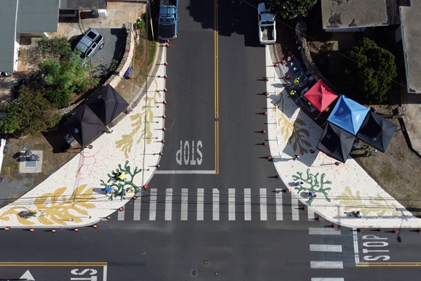 More recently, the Papipi Quick-Build Project, located at the corner of Papipi Road and Hailipo Street/Kapolei Parkway in Ewa Beach, was developed through a partnership with Blue Zones Project: Kapolei-Ewa, Coalition for a Drug-Free Hawaii, LITT Designs, Jeff Pagay Fine Art, AARP and Ulupono Initiative, to support the community's Complete Streets initiative serving 14,000 nearby residents. The project served the City’s Safe Routes to School objective to provide a safe route for the 800-plus students who walked to Ewa Beach Elementary School daily before the onset of the COVID-19 pandemic. It also incorporated vibrant, culturally grounded artwork and high-impact curb extensions and delineators that prompted the City to mark a crosswalk to the city bus stop. The project’s most striking features are its beautiful limu murals—designed by local artists Jeff Pagay, Jim Lynn and Patrick Cullen—spotlighting the rich history and culture of the Ewa Beach community, an oceanside area where limu was once farmed.