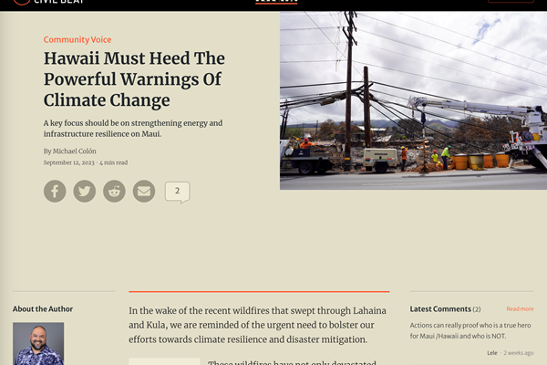 Ulupono Initiative’s Director of Energy, Michael Colón, recently authored an insightful Community Voices column in Honolulu Civil Beat, highlighting the importance of strengthening Hawaii’s energy infrastructure resilience. The August wildfires in Lahaina and Kula have brought the urgent need for increased efforts in climate resilience and disaster mitigation into the spotlight.